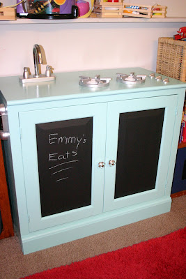 “Repurposing old cabinets and end tables into play kitchens is all the rage, and here’s an example of one done just right! I love the combo of the turquoise paint, chalkboard front, and stainless accents.”