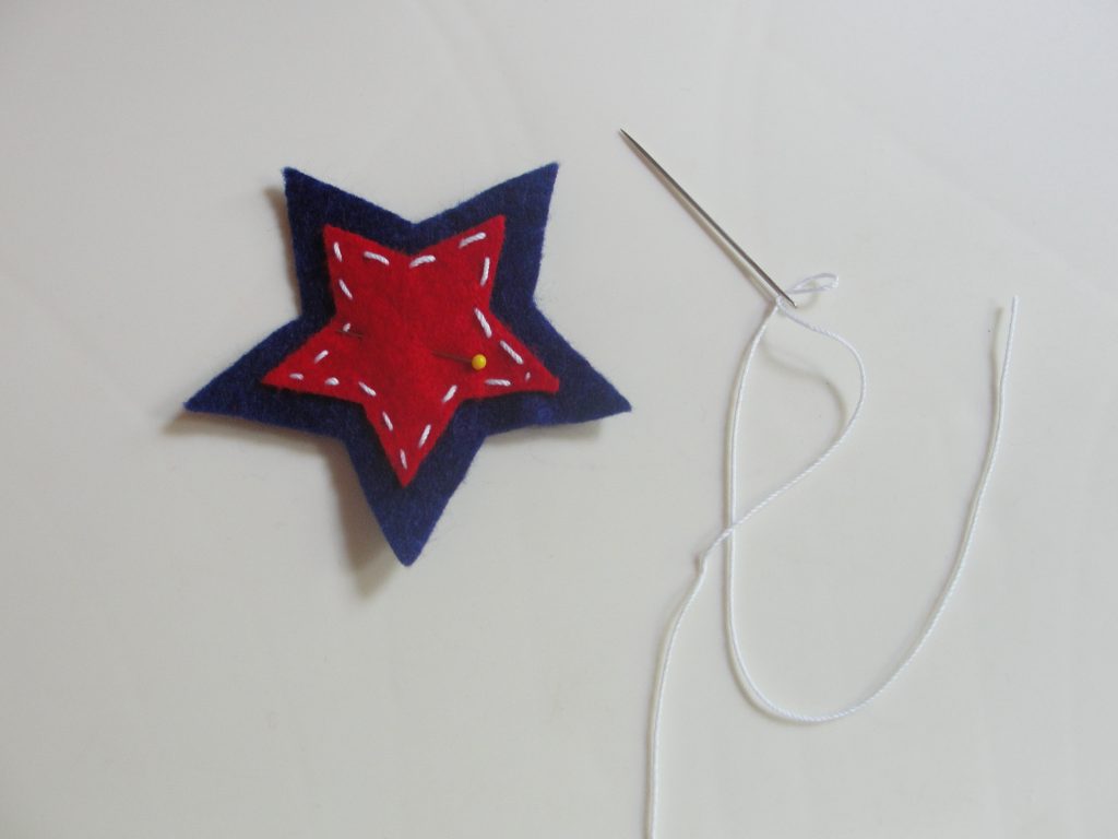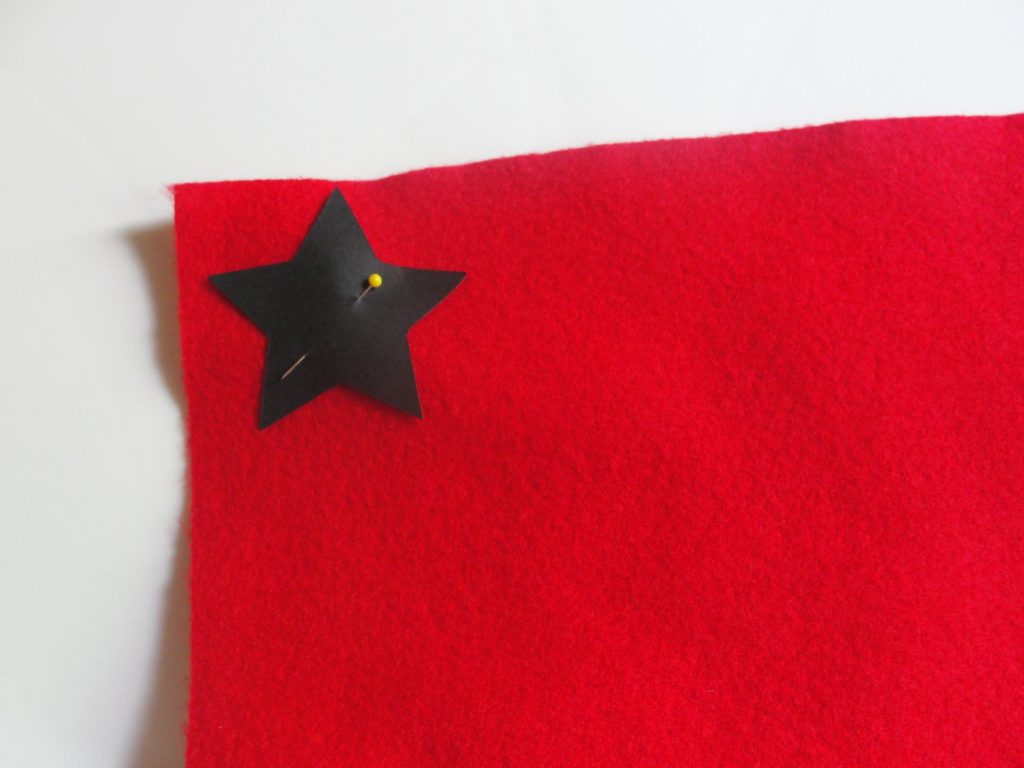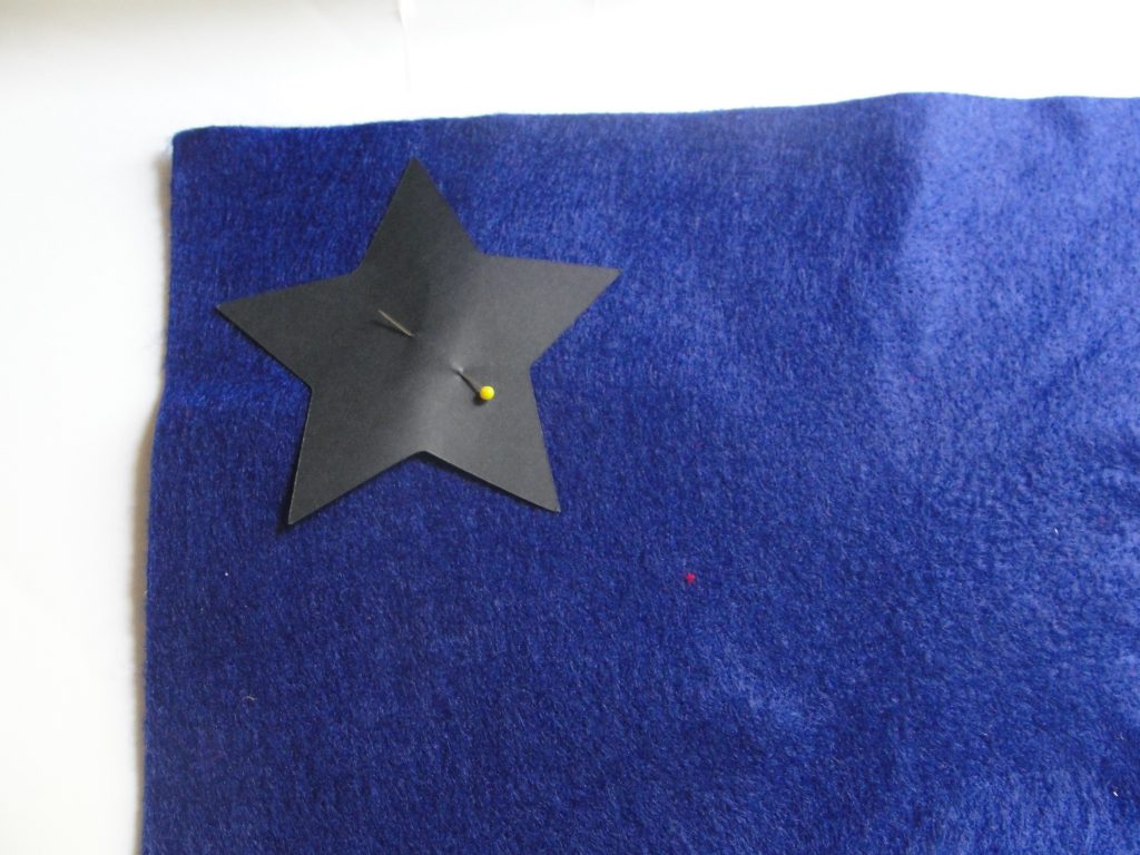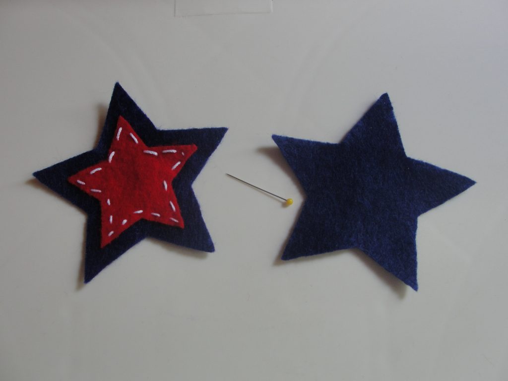 I started by cutting out two different sized star shapes with my cricut. I used these as templates to trace and cut the stars out of felt. I simply pinned each cardstock star onto the felt sheet and cut around it. I then pinned those two together and stiched around the edges of the smaller star with a wide thread.