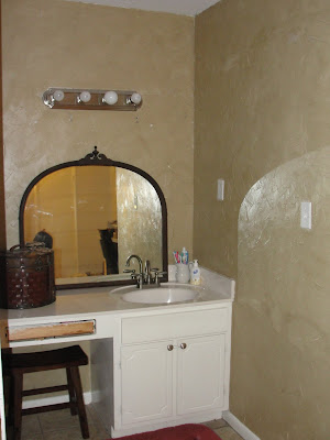 And I turned my Tuscan Bathroom to Beachy Cottage with the help of some lumber, paint and a free chandelier: