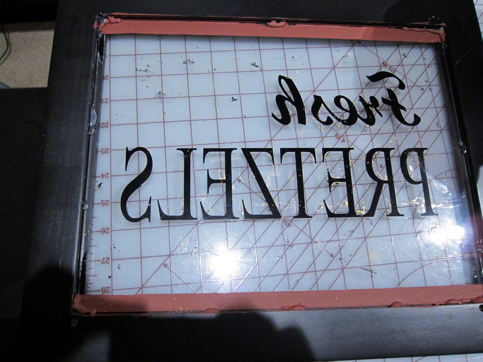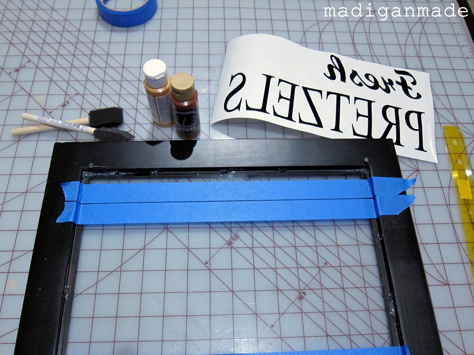 Cut out words in vinyl with a die cutting machine. Make sure the images are a mirror image, so that when adhered to the frame, you’d see the words correctly from the front.