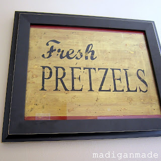 I am slowly redecorating our basement with a sports theme. I wanted a cute piece of art for the room, but I did not want it to scream “sports.” What do you eat at baseball games? What also represents Philadelphia? (we support all their major sports teams, even the Sixers.) The answer… Pretzels!