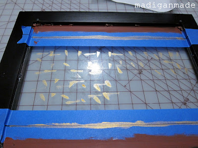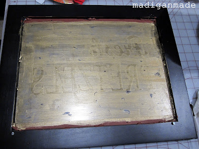 This next part is fun. Start to paint MANY layers of gold paint onto the back of the red lines and vinyl. Every once in awhile you can purposely scratch at the finish, then add another layer of paint. At one point, you can also use a layer of antiquing meduum, too. There really are no rules here. Whatever you do will help add to a layered and worn finish.