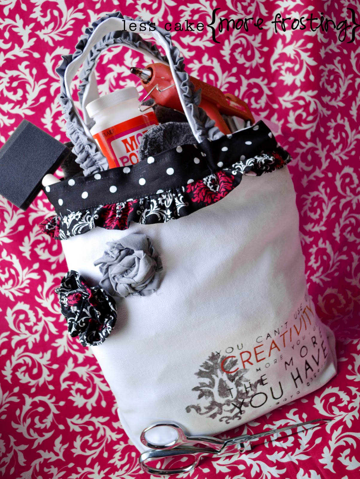 Because I cannot leave well enough, alone….I ended up sewing a band of fabric around the top. Sewing ruffles to the handles. And adding some fabric flowers as well.
