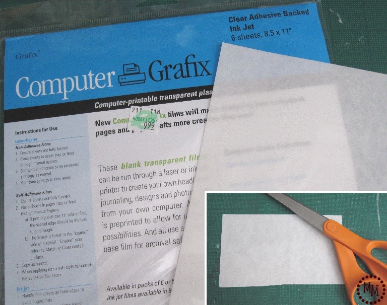 For my transparency, I used a piece of adhesive-backed film that I found at Hobby Lobby. I cut a piece of the transparency that would fit the layout I had designed for the necklace.