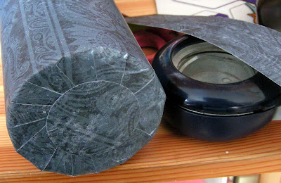 I trimmed my scrapbook paper so that the edges would extend outside the cylinder. I carefully applied Hard Coat Mod Podge a little at a time, and smoothed the paper around the cylinder.