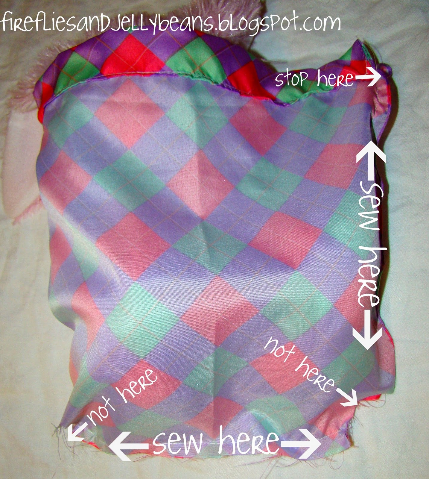 6. Now we are going to sew the back together. Fold your fabric over the plush toy so that right sides are together. Sew down the sides and bottom, but NOT THE CORNERS!! Also stop sewing when you get to the casing.