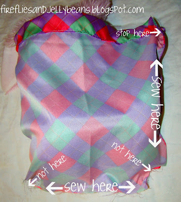 11. Put your ribbons into the INSIDE of the bag and pull about 1/2 an inch out of the square opening on the bottom of the back. Square off the ends of the bag and sew the ribbons in the seam. repeat on the other side.