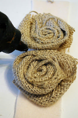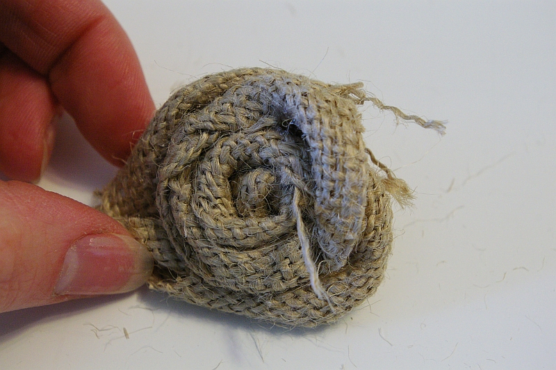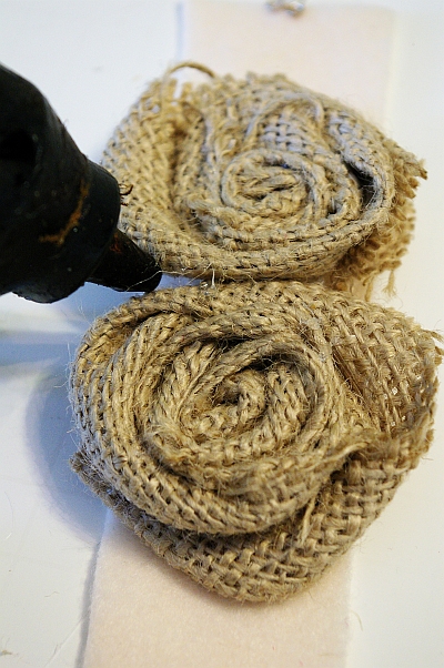 Roll and glue as you go to keep the burlap from unraveling. Twist one way, then another giving each rosette a different shape. Trim any excess pieces or burlap you don’t want on your finished rosette.