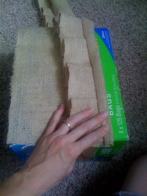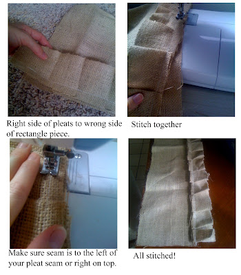 Add a couple inches to each measurement just in case… Always better to have too much and then cut it down than to not cut enough. You can always use the excess for flowers or other fun small things. Cut out a rectangular piece of burlap using those two dimensions you just took. Step 2) Decide how long you want your pleats and then cut out a strip that would wrap around your box 3x (so using your measurements, take the second number and multiply it by 3 to figure out how long to cut the pleat strip). It’s okay if you can’t find a piece that long, it’s easy to patch in a new piece right along with your pleats. If you’d like more details on measuring, cutting, and sewing the pleats, visit my tutorial I did on pleated basket liners. 🙂