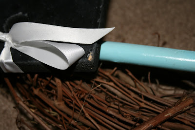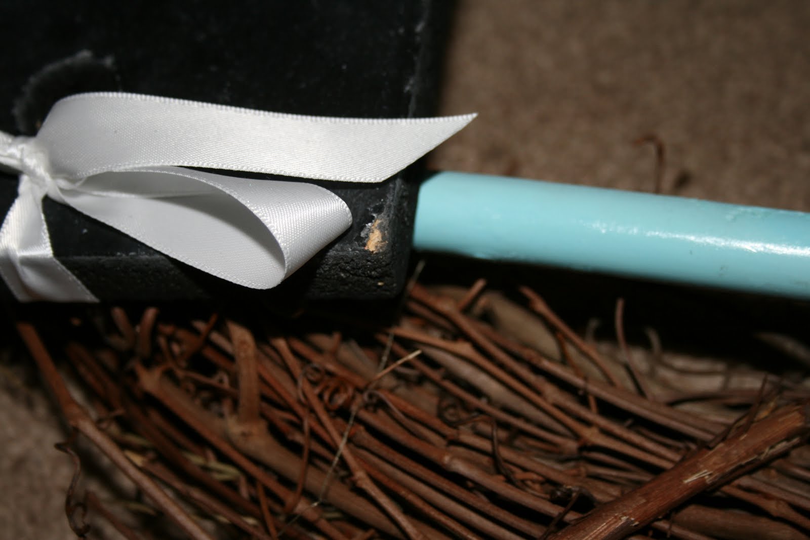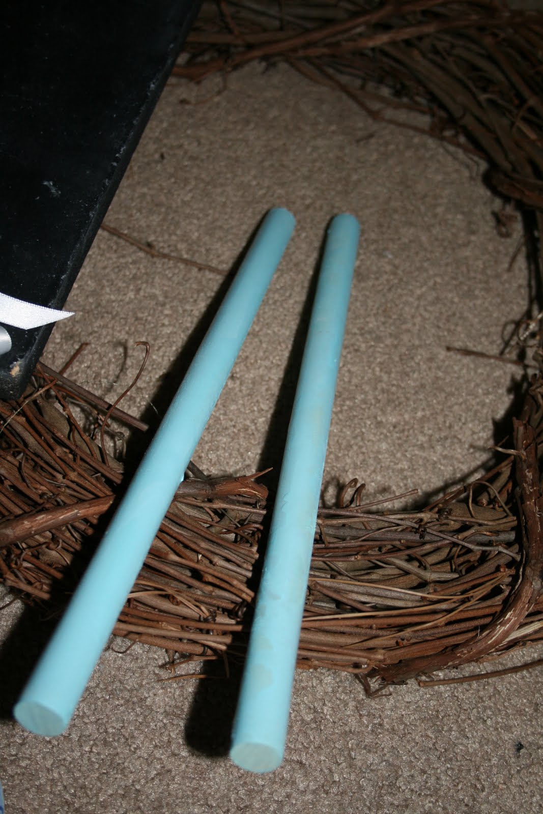 Now your plaque is attached and you could just simply hang it up, write a message and be good to go.But if you want to personalize it more, keep reading!! I decided to attach two dowels (which I quickly spray painted with my favorite Krylon Ocean Breeze Blue. You could pick a more neutral color, but this is my current fave, so I went with it!!) I simply applied hot glue to the bottom of each dowel and stuck it in behind the chalkboard plaque. Then added a bit more hot glue to the top part of the dowels to attach to the wreath. You can see in the photo that I didn’t hot glue at the very top of the dowels – that’s so you have some room to wrap your ribbon around the top.
