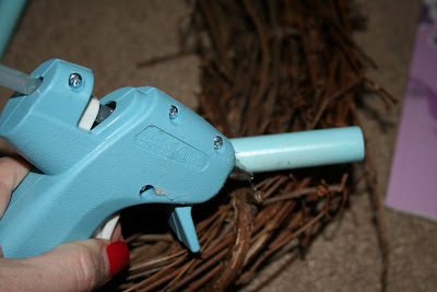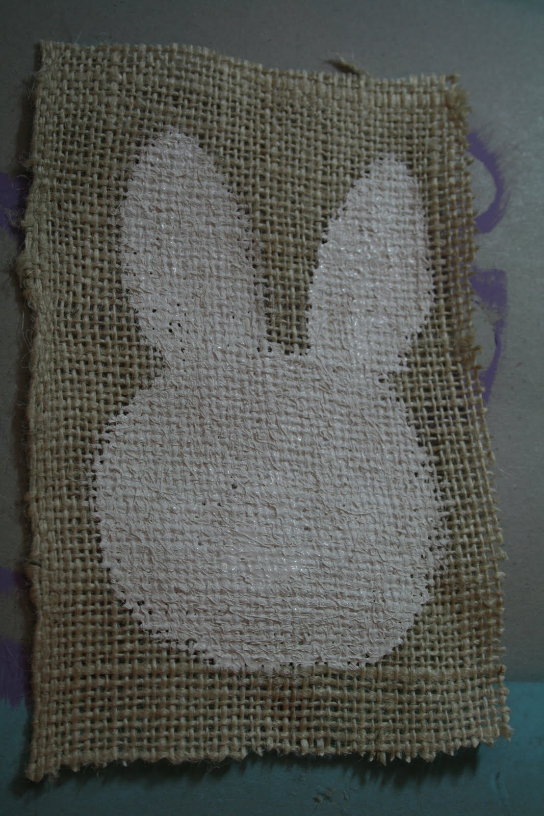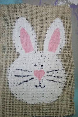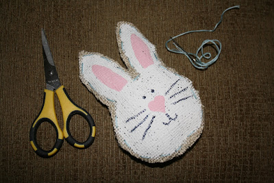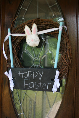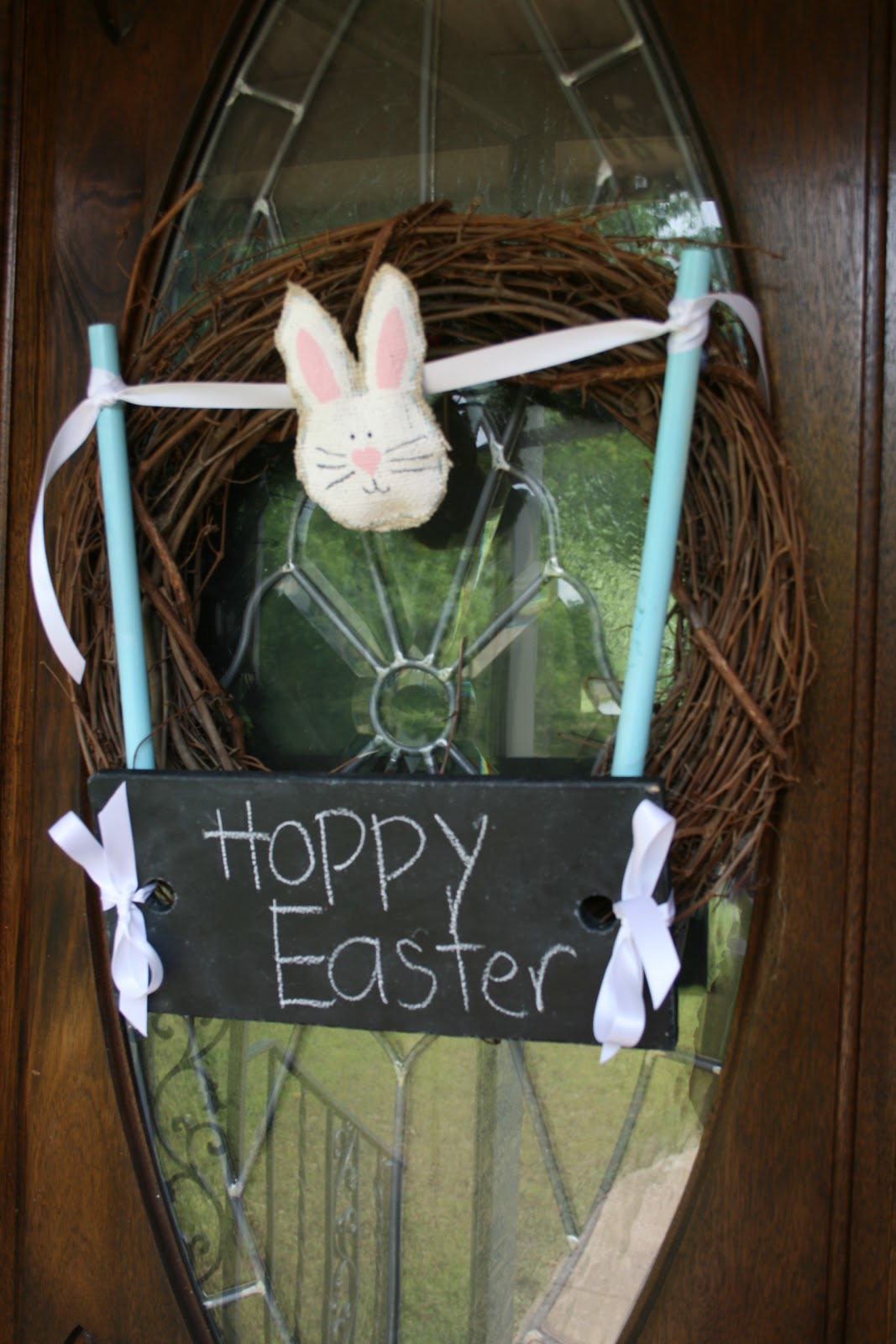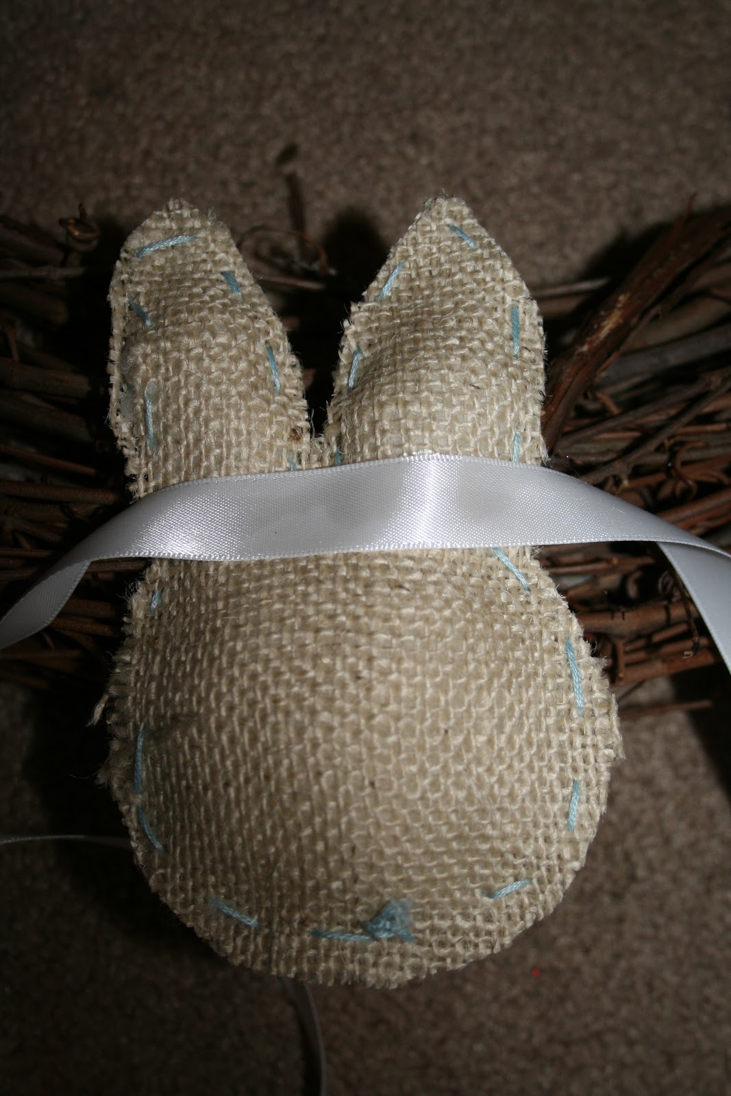 Now, I can change out my decorations easily by tying on a different item between the two dowels. For my wreath right now, I painted a little bunny face on a piece of burlap. I stitched a second piece of burlap to the back (starting at the bottom, going around the ears and stopping about an inch from the first stitch) and stuffed the bunny head with some cotton batting and finished off the bottom with a few more stitches. I used the hot glue gun to attach the little bunny head to some ribbon (about 3 yards long) and then tied the ribbon on to my two dowels.