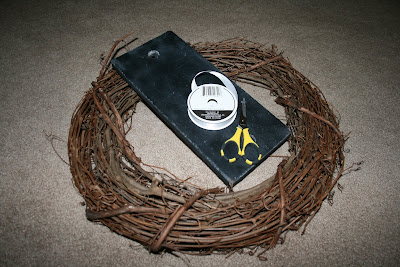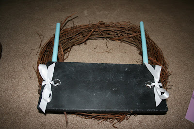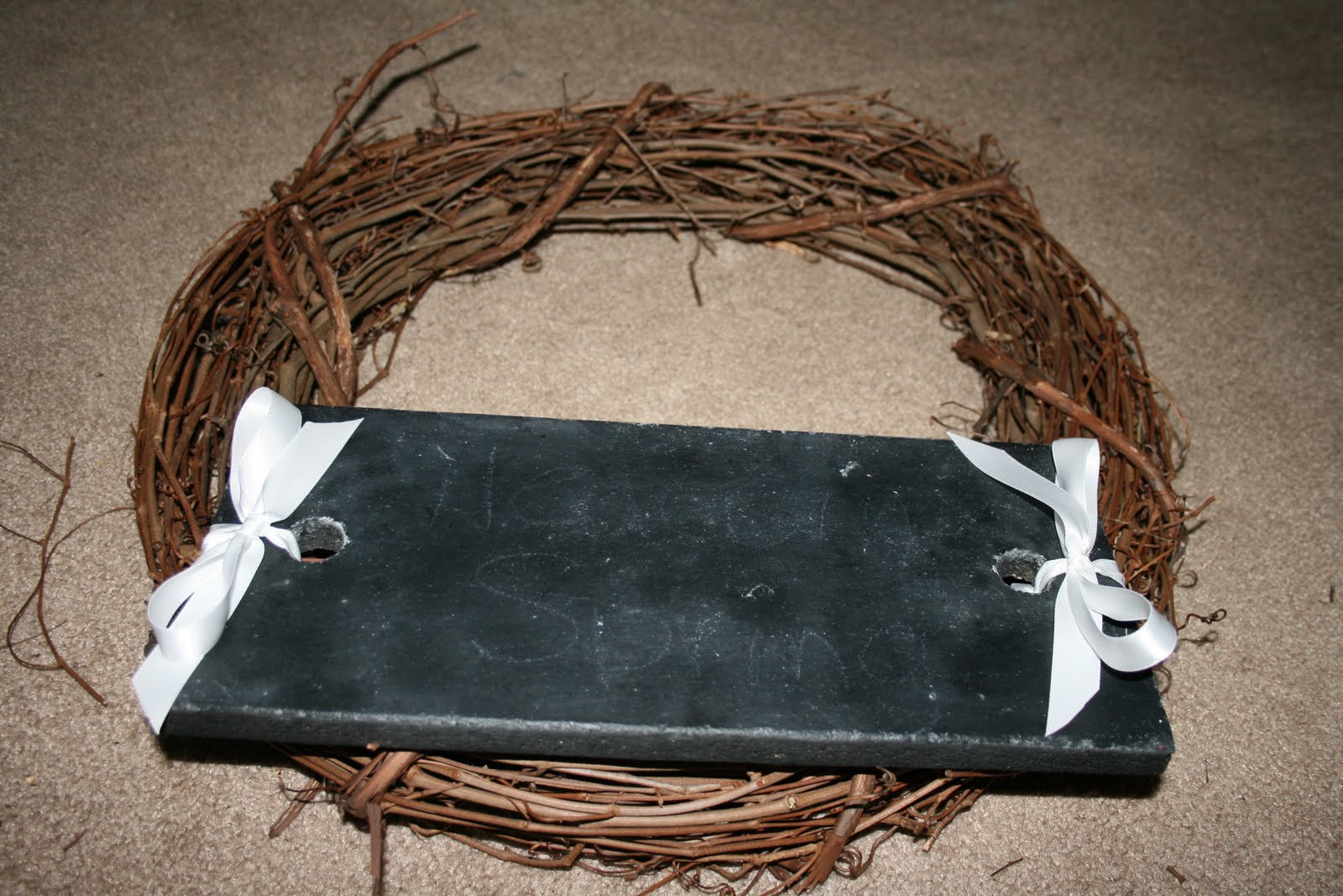 Once it was dry, I gave it a day and then chalked it up and wiped it clean. It was ready to go. I picked a mid sized grapevine wreath, grabbed my ribbon and chalkboard plaque and got to work.