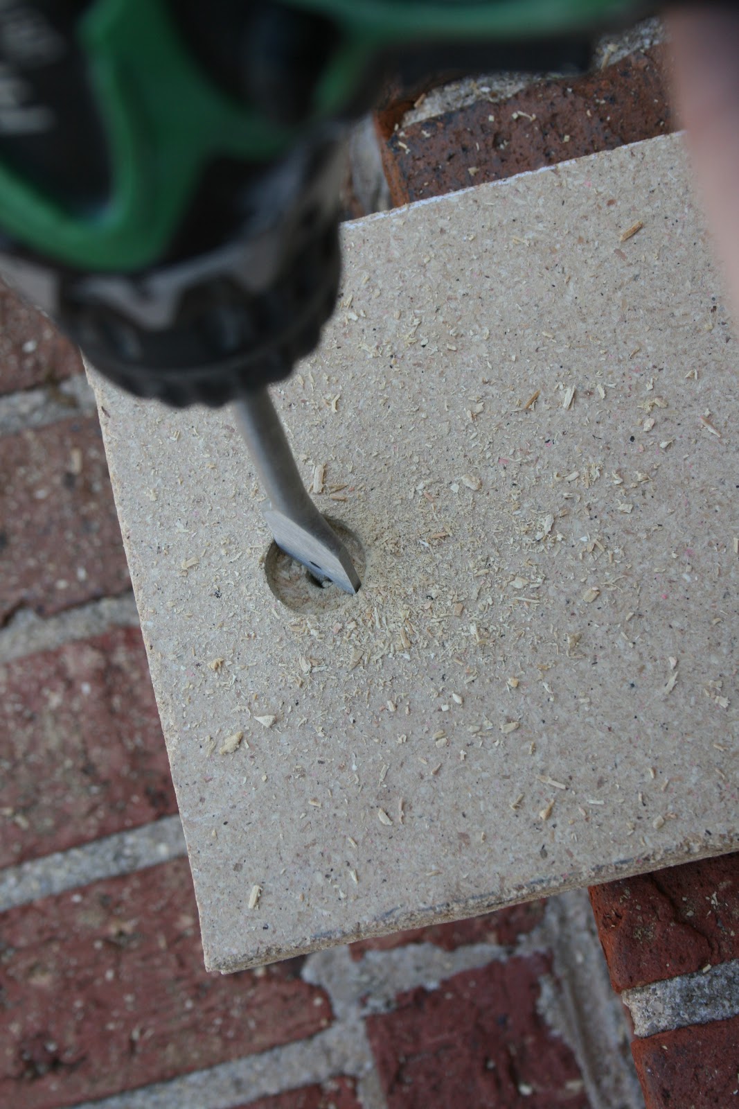 Next I drilled two holes. I don’t have a fancy work place to do any drilling. I just go out on my front porch, hold the wood down with my feet and drill over the edge of a step. It works for me, but does tend to make a mess.