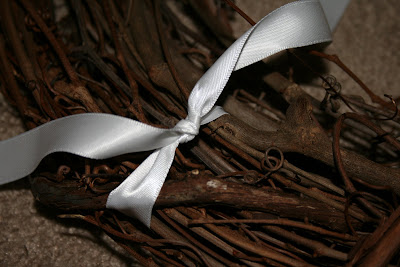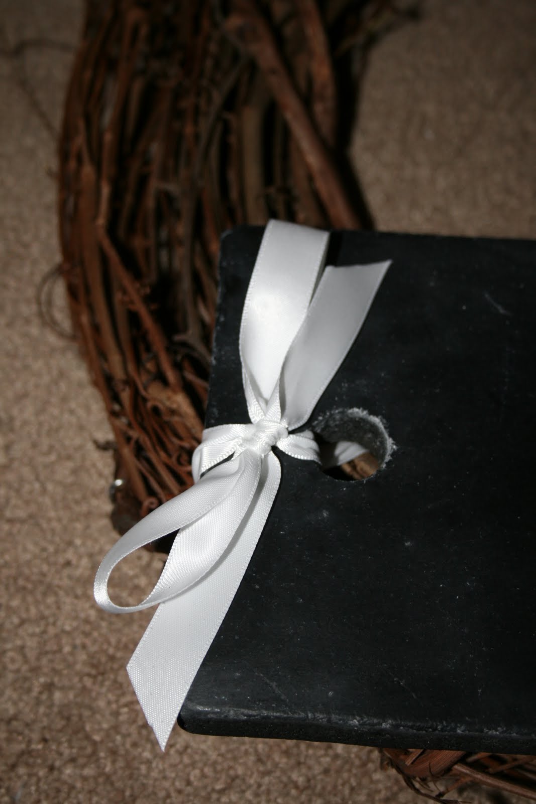 Cut two pieces of ribbon – I didn’t measure, just cut about 18 inches each. I found that a satin ribbon worked better here – I got a tighter knot and prettier bow. Simply thread your ribbon through one spot on the wreath, through the back and back around to the front, double knot it and thread one piece of ribbon through the hole in the plaque and then tie a simple bow.