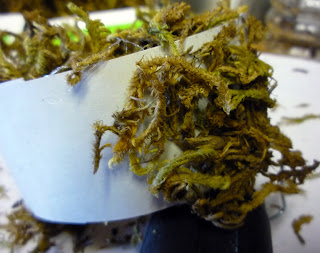 Working your way around the circle, put some hot glue on the cardstock and then press floral moss into it. Fill up all of the spaces both on the outside and the inside. When you are finished, it will resemble a nest. Place on the table runner.