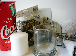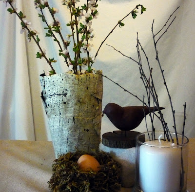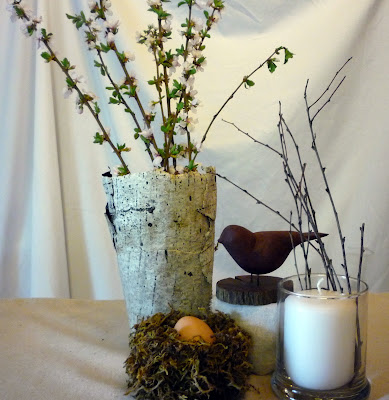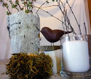 Arrange all of the elements. Place the candle in the holder, along with some twigs. Place the egg in the moss "nest." I found a cute little wooden bird statue that I placed in among the other pieces, but another candle or smaller vase would work just as well. The key is to have a variety of sizes, shapes, and colors. I have faith that you will know what looks good to you.