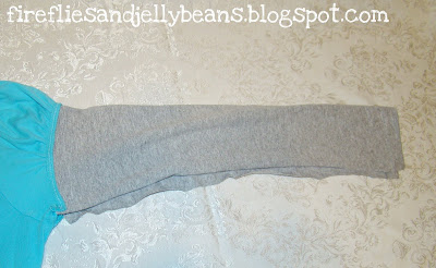 Use another long sleeve knit shirt as a sleeve template. Lay out your sleeve on the side of the extra t-shirt with the wrist in the bottom (That way the sleeve is already hemmed for you!) . Cut out your sleeve leave at least 1/2 inch as a seam allowance. You should be cutting though 2 layers of fabric. Repeat with the other sleeve on the other side of your shirt.