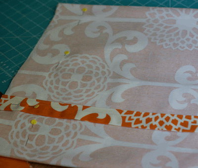 Once the top & bottom are hemmed, place the fabric back around the pillow form, right-sides-in, the way you would like it to be on the finished pillow…gently remove the pillow from the fabric & pin the sides of the pillow together…