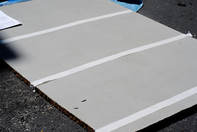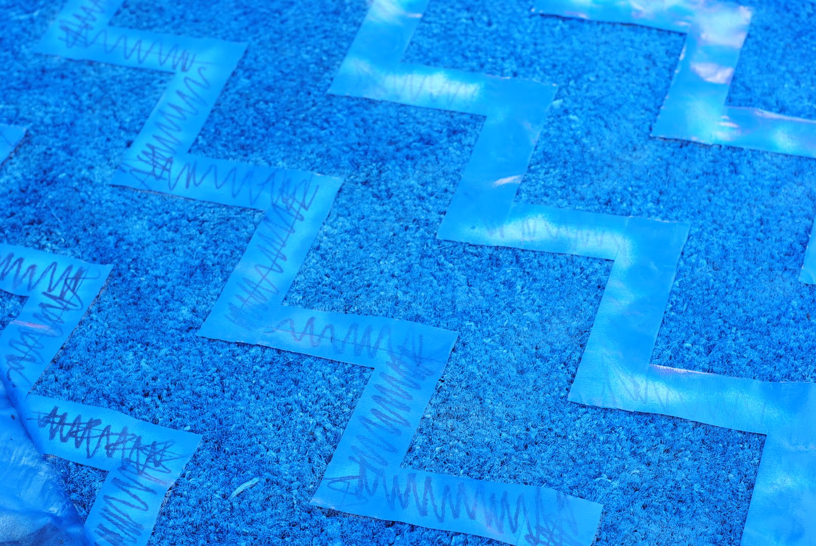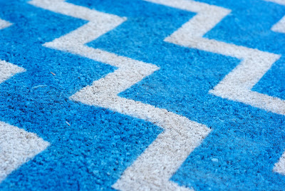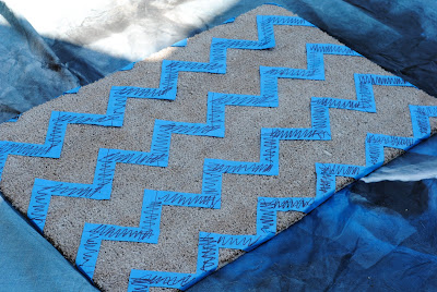 Step Six: Woot. You’ve got chevron. Take a moment to celebrate your hard work. Step Seven: Now, the fun part. If by "fun" you mean inhaling fumes and decorating your driveway several different colors from the overspray. 😉 Take your darker color and spraypaint all over the mat. Again, this took several light coats at close range to get an even color all around.