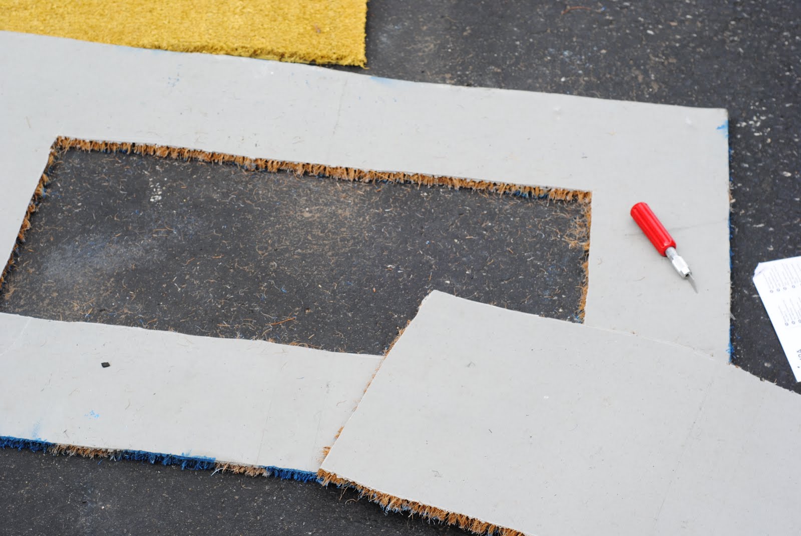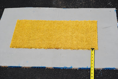Step One: We’re going to make the outside portion of the mat first. You’ll need to decide which colors you’d like to use. Through trial and error I found saturated colors seem to work best, but this was only after I’d used white. So for the alternating color I went for a bold blue. Use the lighter of your two colors for your base color (for me, white). Spraypaint the entire mat in that color using even strokes and several coats. Unlike most spraypainting projects, I found I needed to get pretty close with the can while spraying since the material is porous and absorbs it.