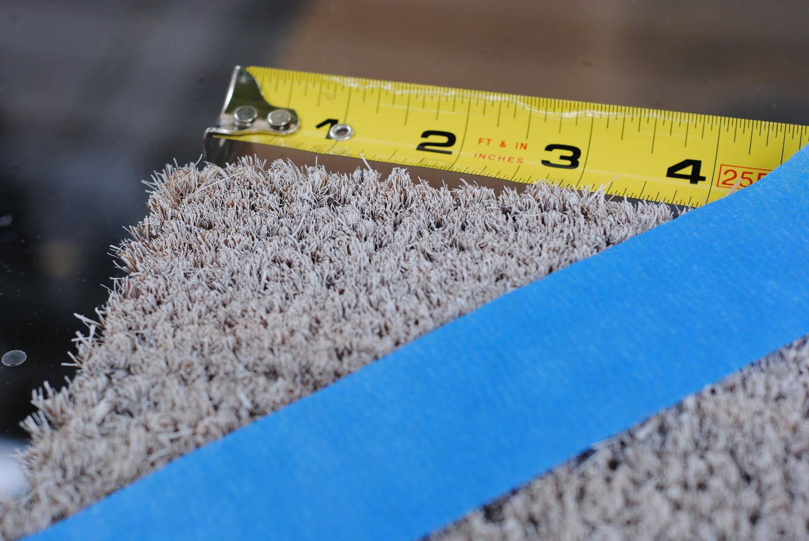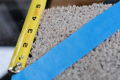 Working across the mat, I continued placing tape every 4 inches (measuring from the back edge of the previous piece) until I reached the end. It’s very important to measure both across and down for each piece to make sure you are keeping them level with previous pieces.