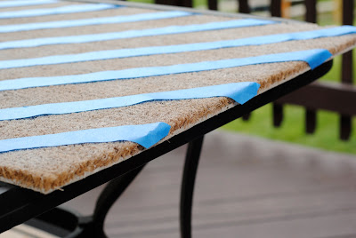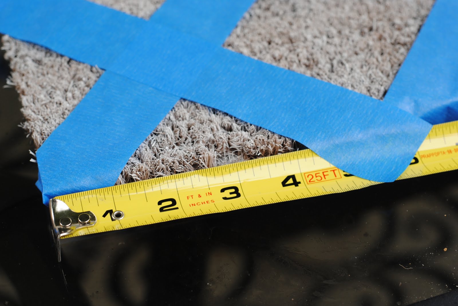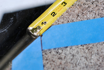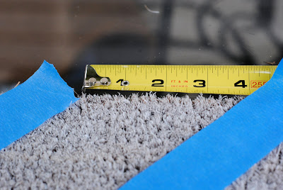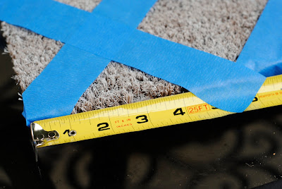 Step Two: Using 1 1/2 inch sized painter’s tape, I made a trellis pattern across the first mat. Starting at the upper left hand corner, I measured out 4 inches across the top and placed the top of the tape at that spot.
