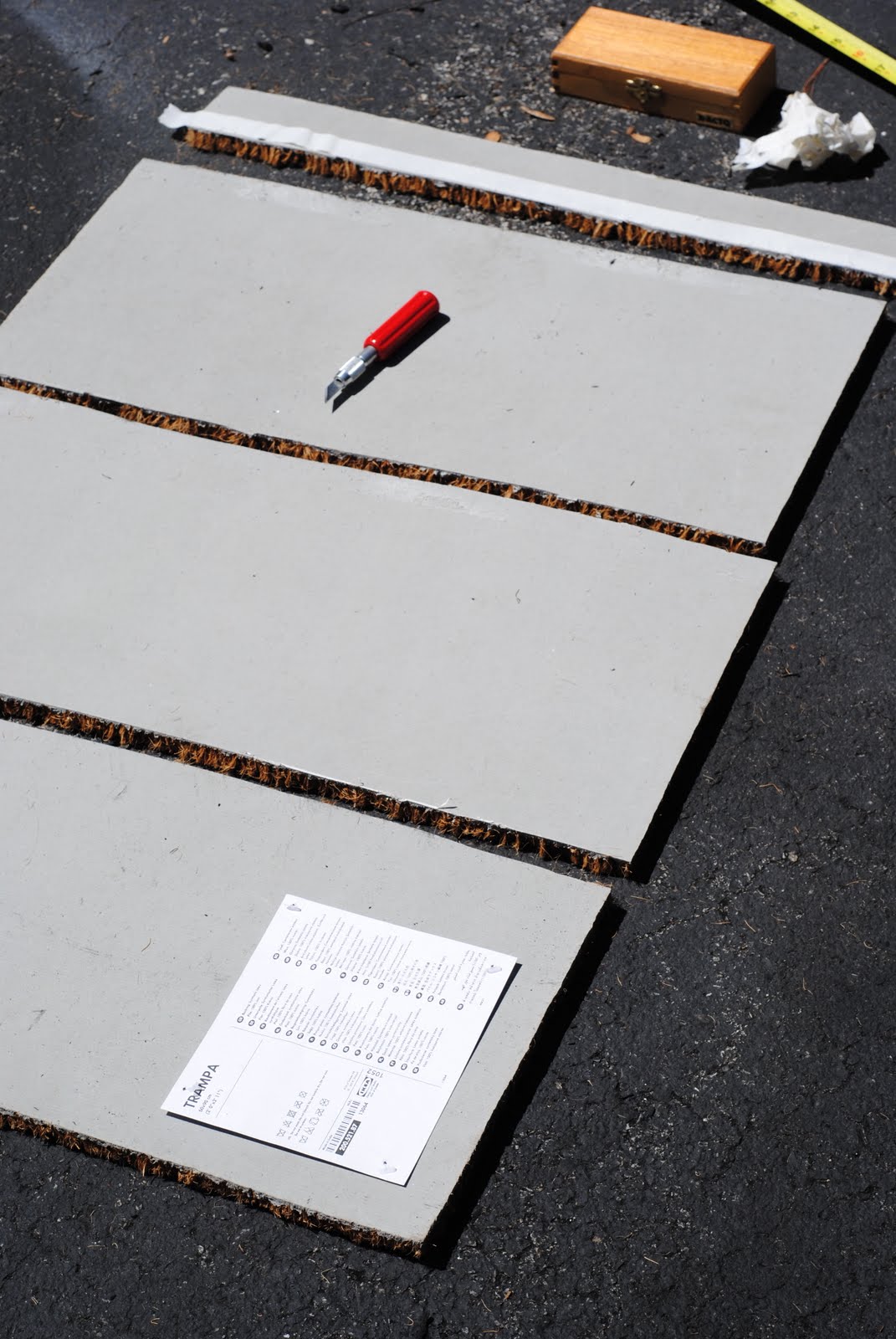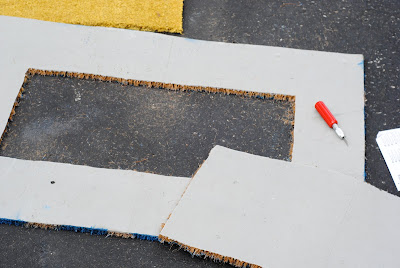 Step Eleven: Lay your first mat facedown, and use an insert piece as a template in the center. If you are a math person, you can also measure to figure out where exactly to cut. I used a pen to trace the template, then used my large exacto knife to cut through the rubber bottom. The IKEA mats were very easy to cut using this method.