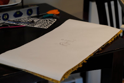 Step Twelve: To create the inserts, I spraypainted the base colors first (again, use the lighter color for the base). For all you lucky duck Silhouette owners, this next part will be a cinch. The rest of us need to improvise. If you use a vinyl decal, sticker, etc. then you will place it on the mat, spray all over it, then peel it up. Your image will be the original background color. If you don’t have a decal, you can make one using freezer paper. I decided to make a stencil, so the color of the image would be the last (darker) color I sprayed. First, cut off a piece of freezer paper in the size of your mat. Find the center. Then draw what you want on the stencil (or use a computer image transferred to the freezer paper, for all you perfectionist types):