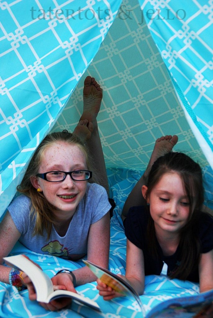 hannah and ella reading in the teepee