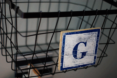 Those are the hooks that started it all…I found some baskets on clearance at Kohl’s (just $10 each after my additional 30% off) and hung them from the hooks…then I attached little wooden initial blocks that I got from a craft show years ago to the front of the baskets with twist ties. The boys are keeping some of their stuffed animals and odds and ends in there now…