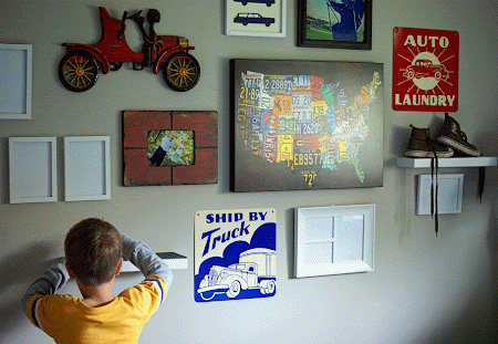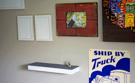 The opposite wall (where the dressers used to be) was completely empty now, so I decided a little gallery wall would be an awesome space filler…my boys LOVE cars and legos…(like seriously love…it’s kinda weird)…so we’re filling the wall with both (some of the frames are empty, as you can see…we’re still working out what’s going to go in them…). Oh, and yes…those are shoes on the shelf…my son put them there…I think they look pretty cool…
