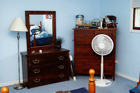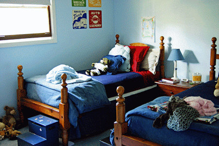 I moved both beds under the window…now we can access both closets without tripping over Tyler’s bed…oooh, just look at that wall color! I can’t get over it…