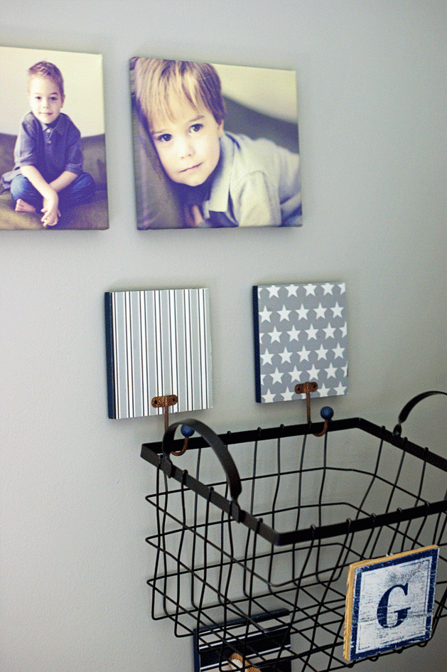 Those are the hooks that started it all…I found some baskets on clearance at Kohl’s (just $10 each after my additional 30% off) and hung them from the hooks…then I attached little wooden initial blocks that I got from a craft show years ago to the front of the baskets with twist ties. The boys are keeping some of their stuffed animals and odds and ends in there now…