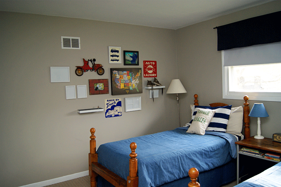 The opposite wall (where the dressers used to be) was completely empty now, so I decided a little gallery wall would be an awesome space filler…my boys LOVE cars and legos…(like seriously love…it’s kinda weird)…so we’re filling the wall with both (some of the frames are empty, as you can see…we’re still working out what’s going to go in them…). Oh, and yes…those are shoes on the shelf…my son put them there…I think they look pretty cool…