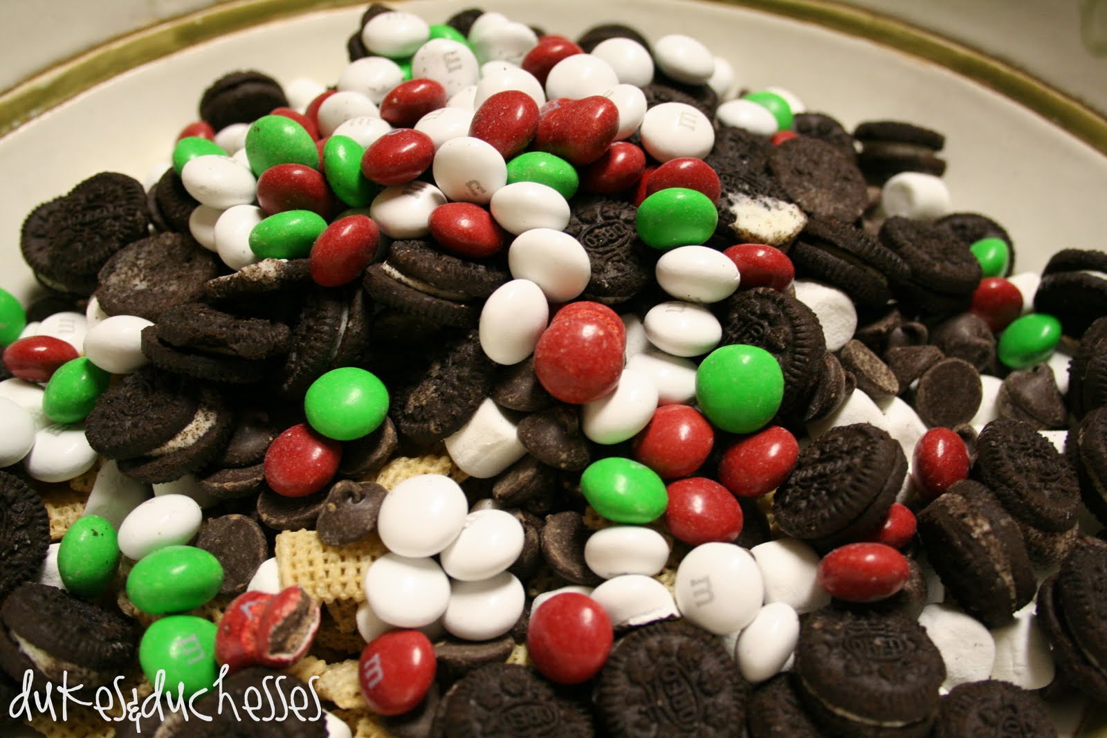Mix together 6 cups rice chex, 1 1/2 cups mini marshmallows, 1 1/2 cups mini oreos, 1 cup jumbo chocolate chips, and 1 cup mint M&M’s. Doesn’t it look festive?