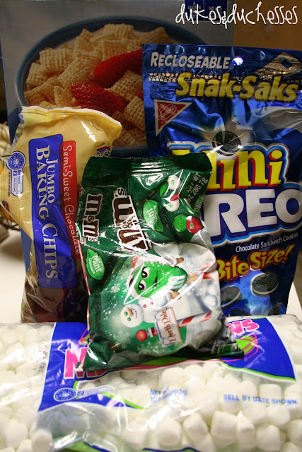 You’ll need five ingredients for the mix: rice chex {if you’re cheap like I am, the store brand is great}, mini marshmallows, jumbo chocolate chips or chunks, mini oreos, and mint M&M’s.