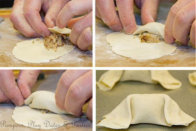 One at a time, roll the dough balls into an oval shape, pat flat, and roll very thinly into a crescent shape. Place about 1/2 to 1 tsp of filling into one side of the crescent.
