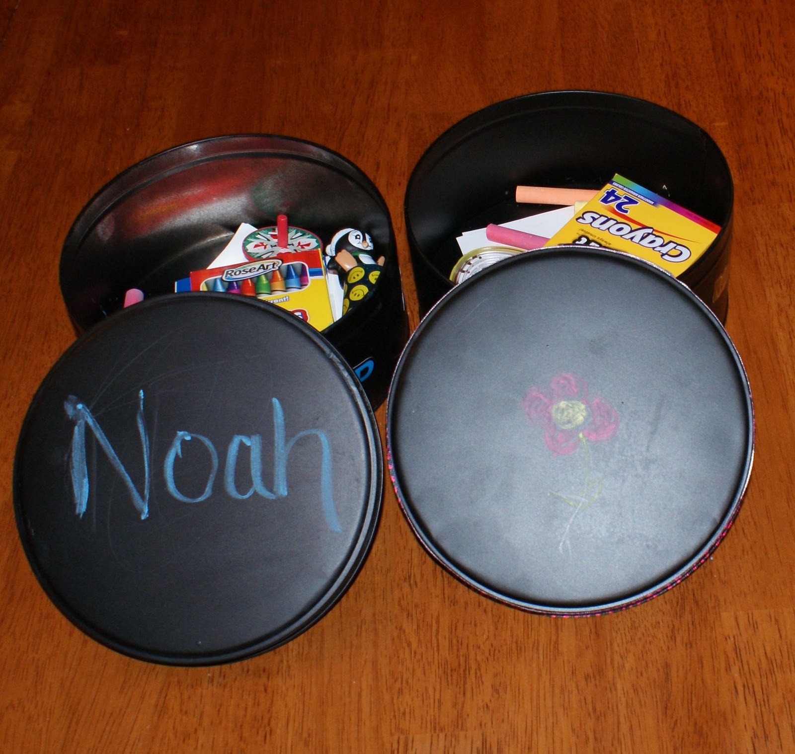 I purposely did not embellish the lids of the tins so that kids can use the chalk and draw on the lid.