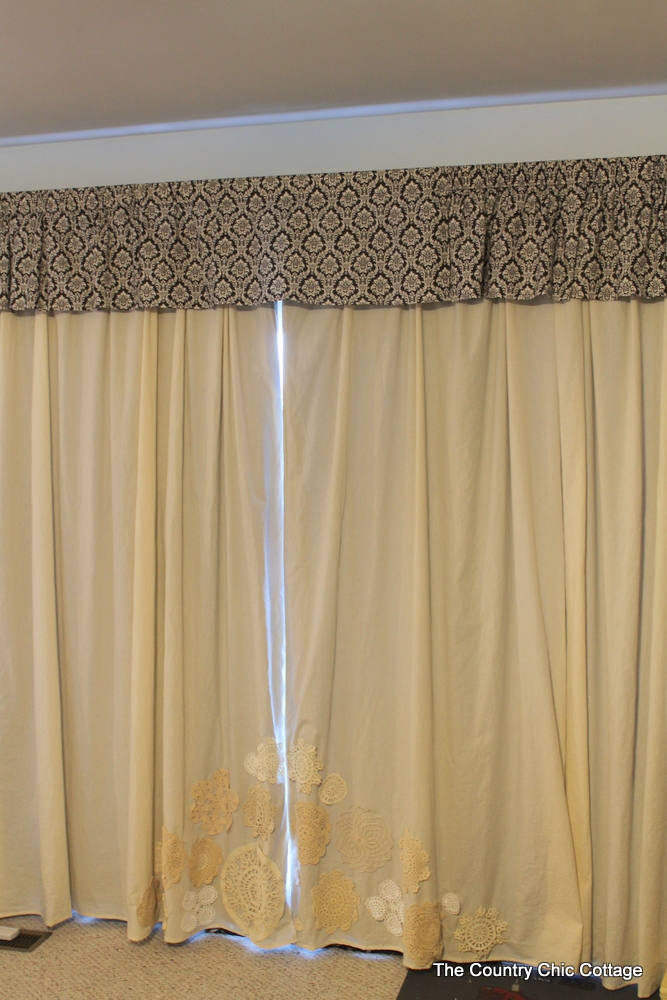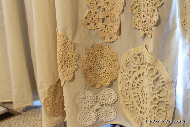 I then hand tacked each doily in place. Right there on the curtain. How many tacks you need really depends on the size and shape of the doily. I just kept tacking until the each looked right. I did this in a series of nightly sewing sessions. I would do a few doilies each night. Leaving the rest pinned into place.