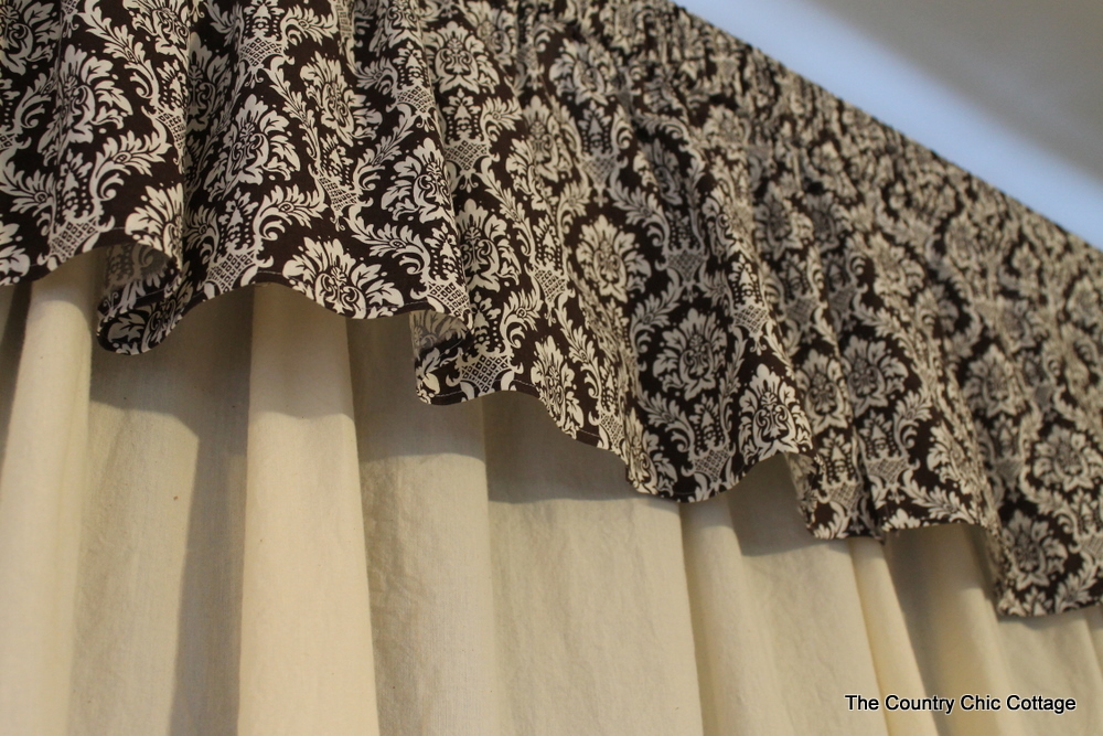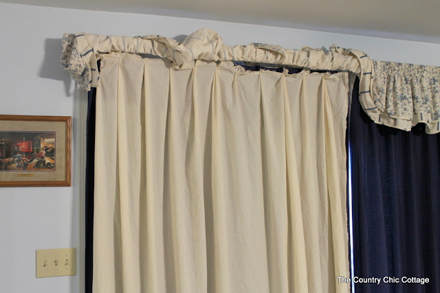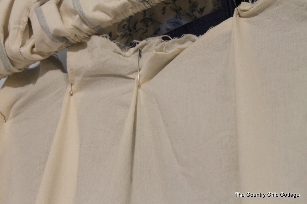 I bought 108″ wide muslin in the fabric section. It was about $30 to buy enough to cover my curtains. Remember to think of fullness. So buy about 1 1/2 to 2 times the width you need so you can scrunch it up. My plan was to make a whole new valance. That means the top of the curtains will continue to be covered up. Good news. I didn’t have to worry about how the top looked. So I used safety pins to pin the muslin onto my curtains…safety pins!!
