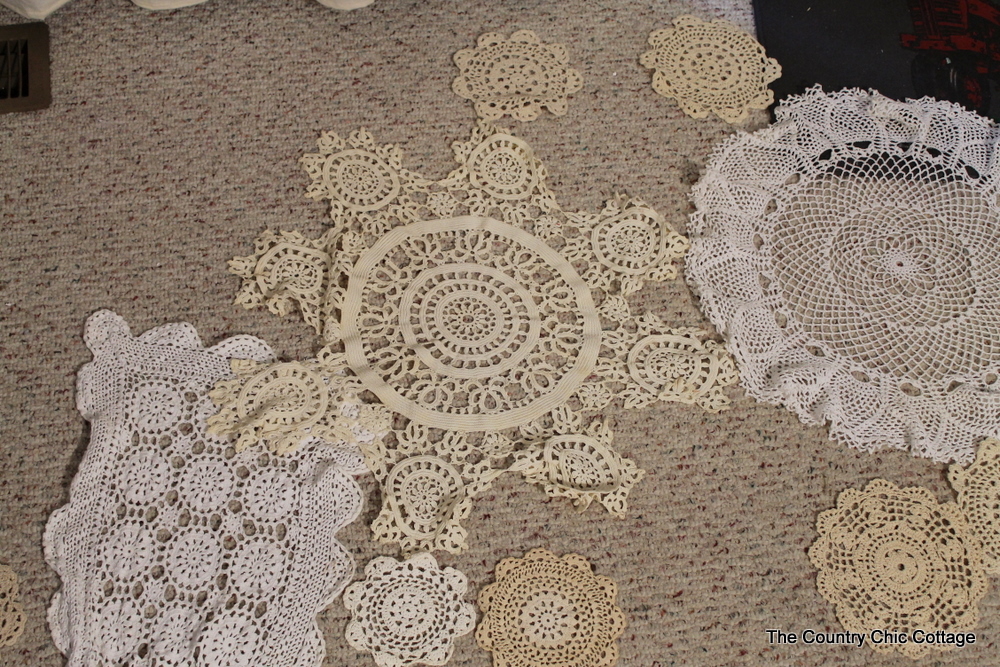 I knew I wanted to add some doilies to the curtains but I really did not know how I wanted them. I have been collecting doilies of various shapes, sizes, colors, etc for some time. I picked them up at yard sales and thrift stores. First I laid them all out on the floor….