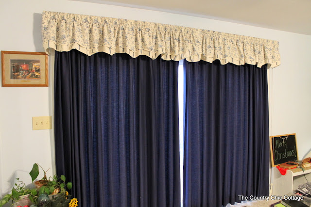 First y’all need to see what I started with. I have had these blue curtains for over 9 years. That is tragic all by itself. I was so sick of blue. Sick, sick, sick. But these are really nice curtains. Lined, insulated. They are in front of a door and two floor length windows, so lined and insulated is important. I just did not have the money to buy new curtains for the entire window. So I covered my curtains…covered them! Ready to learn how?