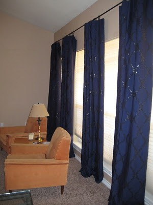 I loved the finished product and was impressed by the creative approach taken with the entire project, beginning with the canny purchase of “drapes” from the sheet department at Walmart. When Rachelle countered her husband’s critique of “too plain” byusing the design stencil intended for walls to embellish her “drapes”she demonstrated creative use of resources she already had. The accidental metallic results were just a serendipitous conclusion to this winning project.
