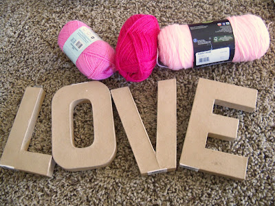 Start with your letters… mine are 8″ hollow cardboard letters. I found them at JoAnn’s for $1.99 each, but I’m sure you could find something similar at any craft store. I used 3 different colors of yarn because I wanted to create an “ombre” effect, but I think they would look just as cute in one color if you have some yarn you need to use up 🙂