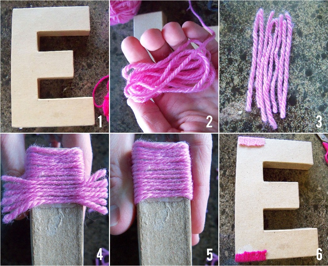 7. For the letter E, you will need to wrap each of the 3 “arms” first, in a vertical direction. Wrap each section separately, and secure the ends of the yarn on the back of the letter with a drop of hot glue {or tape, if you don’t want to burn your fingers like I did!}