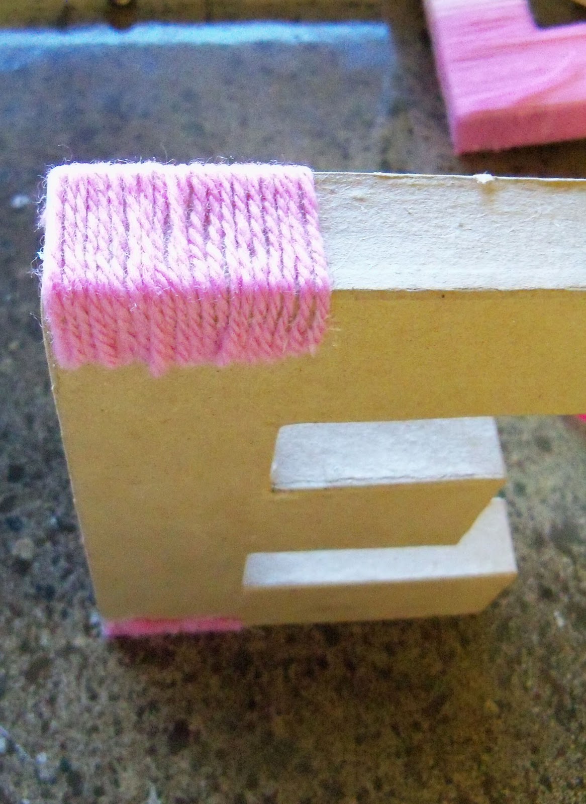 The trick to wrapping these letters is the number of surfaces that have to be covered. You can’t simply wrap in one direction and cover the front, back, and all the edges. On a few of my edges {ends of the letters} I ended up using a technique where I glued the yarn instead of wrapping. I tried both ways, and this ended up being much faster. You need to figure out which edges need the “glue” method and do those first. Here’s how I did it:
