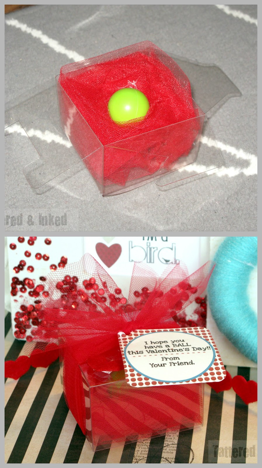 valentine printables so I wound a bit of the red tulle into the box, nestled a bouncy ball in the middle and then tied it up all pretty!