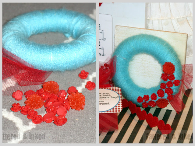 I had a little mini wreath on hand so I wound it with aqua yarn and then glued the flowers on.