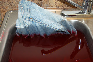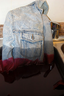 READ the directions on the bottle!!! With the ombre style of dying, you cannot dye in the washing machine, you need either a big tub, or I used the sink. If you have a porcelain sink, especially one with scratches in it, do NOT dye in it.. you will have a lasting memory and evidence of the dye job! I have a metal sink, so it worked perfect. I followed the directions, hot water, salt and stirred well to mix up the dye. With Ombre dying, you really want the graduated colors to come through, so you dye a little at a time..My first project was my old jean jacket.. I bought this jacket when I live in Germany in 1987! I loved it then, but it was screaming for a change..