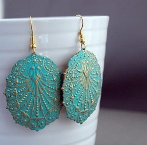 We’ve seen several variations of painted earrings, but these ones from Catherine are one of our very favorites! We love her combination of turquoise and gold, so on trend! The texture of the “brass stampings” is really cool, we’ll have to look for some of these online. Gorgeous!
